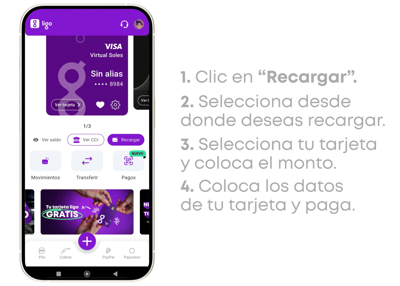 Durante la vigencia de la campaña, los usuarios nuevos de Ligo que realicen su primera recarga con tarjeta de crédito recibirán la devolución del 100% de la comisión cobrada por Ligo, hasta un máximo de S/50. Aplica hasta agotar stock.